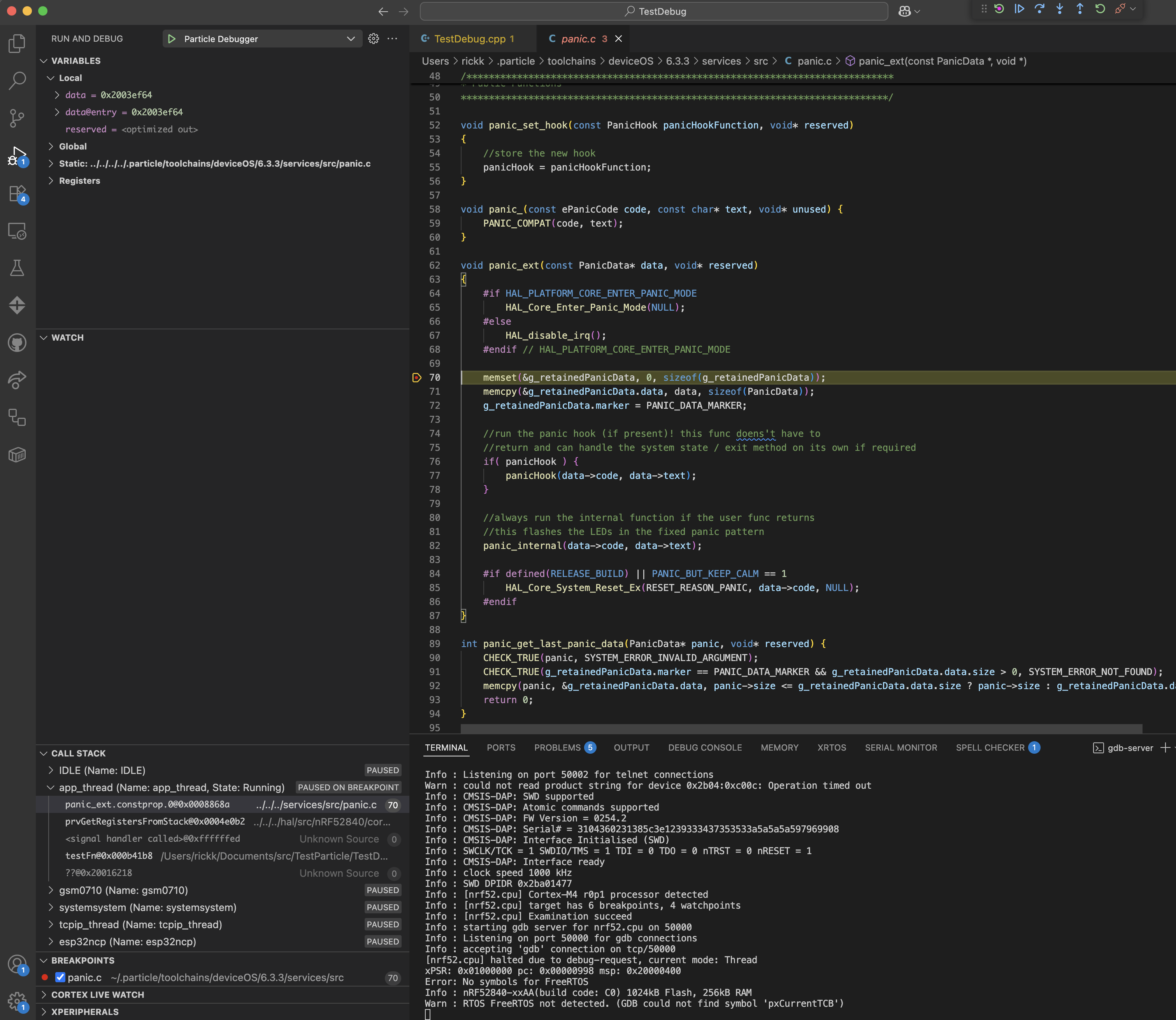 - Particle: Flash application & Device OS for debug (local)